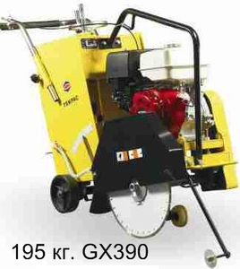 Данное оборудование оснащено бензиновым двигателем HONDA и является самоходным. А так как в машине стоит бензиновый двигатель, эксплуатация данной машины предусмотрена в автономном режиме. Резчик швов оснащен баком для воды, для охлаждения режущей части диска. Для обеспечения точности в резки шва машина имеет направляющую рейку. А специальная рукоять для поднятия диска делает работу удобной и качественной.